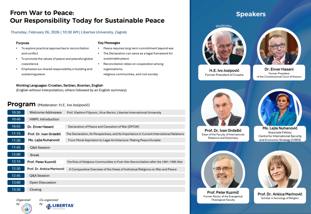 Na Sveučilištu Libertas, u suradnji s više nevladinih i studentskih udruga, održana je 26. veljače jednodnevna konferencija “From War to Peace: Our Responsibility Today for Sustainable Peace”.